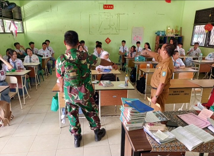 Babinsa Koramil 1202-03/Singkawang Tengah, Serda Kamid, memberikan pembekalan Materi wawasan kebangsaan dan motivasi belajar kepada para siswa SMKN 2 Singkawang yang berlokasi di Kelurahan Jawa, Kecamatan Singkawang Tengah, Kota Singkawang. Selasa (21/10/2025).