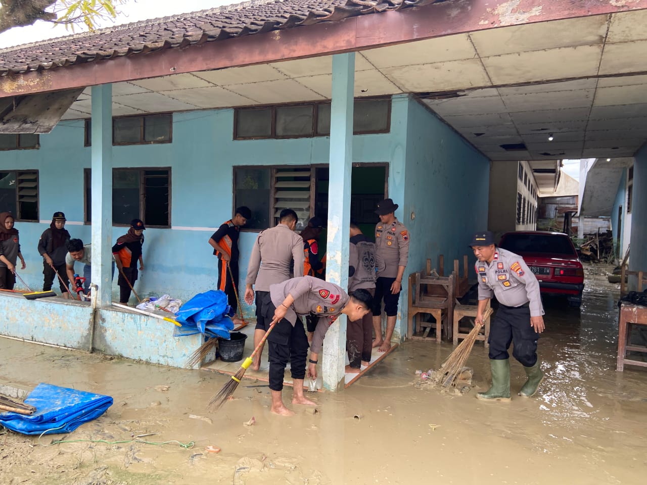 Menggunakan peralatan sederhana seperti sapu, pel, sekop, ember hingga penyedot air, mereka berjibaku membersihkan setiap sudut sekolah yang terdampak banjir.