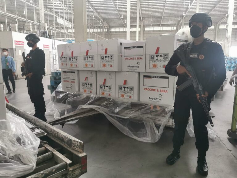 bpi91.com DELI SERDANG – Satuan Brimob Polda Sumut kembali lakukan pengawalan kedatangan Vaksin Moderna dan Coronavac yang tiba di Terminal Cargo Bandara Kualanamu, Kabupaten Deliserdang, Senin (17/1/22).