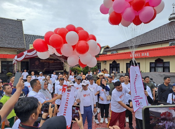 Dalam rangka memperingati Hari Ulang Tahun Bhayangkara ke-79, Komando Distrik Militer 1013 turut ambil bagian dalam acara jalan sehat yang diselenggarakan oleh Polres Barito Utara, Sabtu pagi (28/6).
