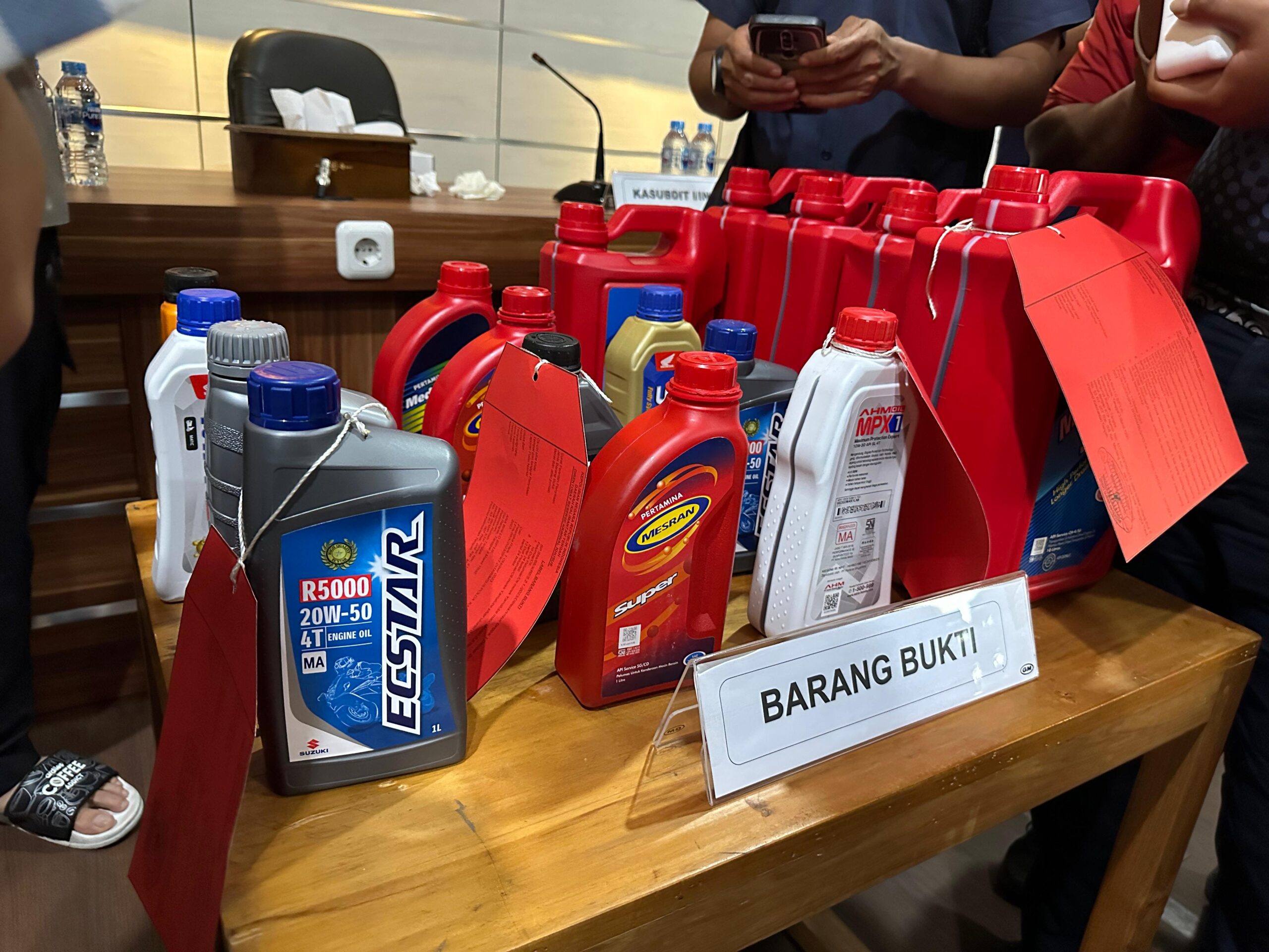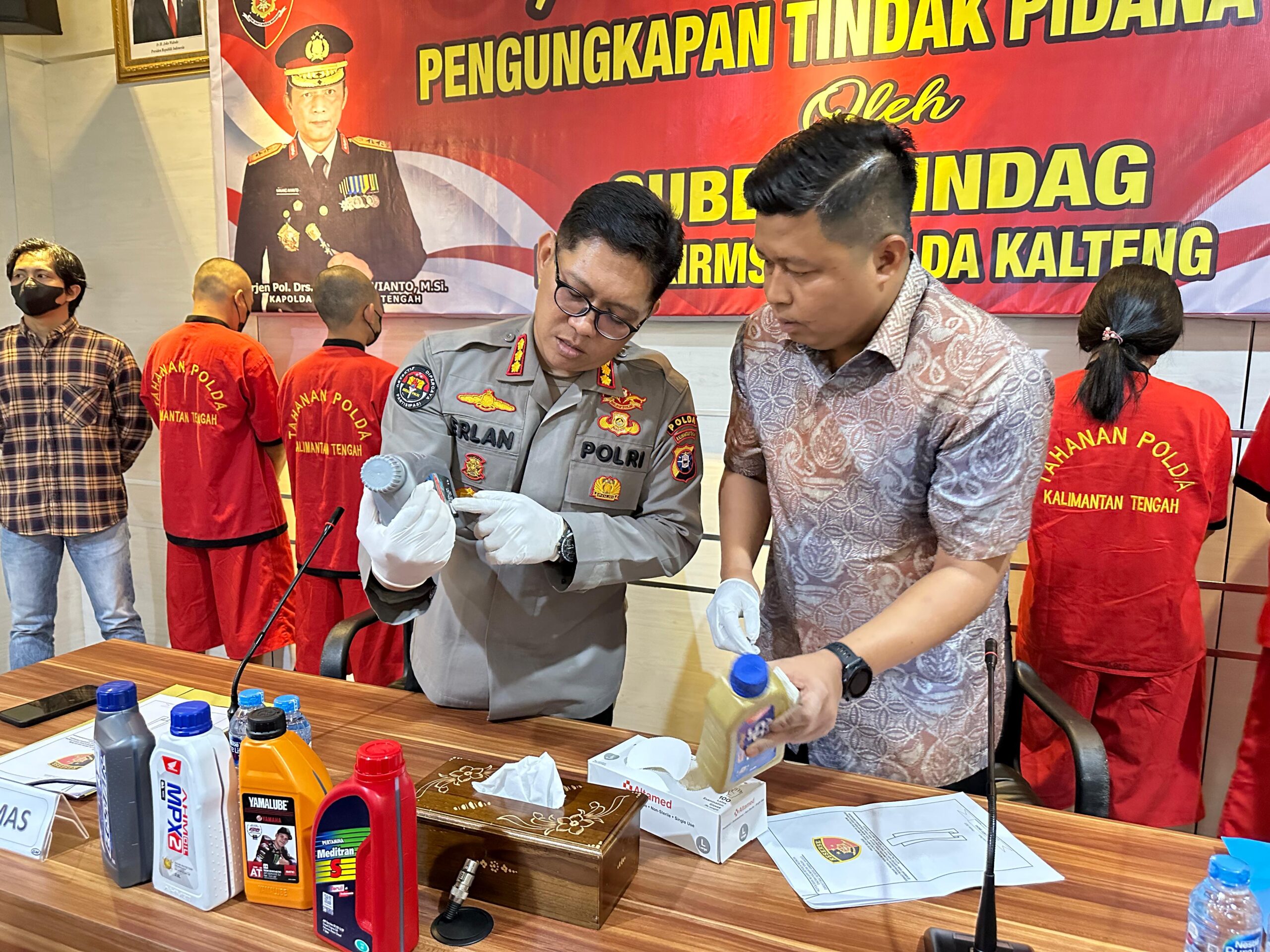 Dari kelima pelaku tersebut, empat (4) diantaranya TA (48), A (33), HF (31) dan RD (26) berhasil diamankan disebuah pertokoan Citra Mandiri, Jl. Seth Adjie, Kota Palangka Raya, atas dugaan kepemilikan 11.867 botol pelumas atau oli palsu, dengan merek AHM Oil, Yamalube, Ecstar, Meditran, dan Mesran serta Enduro.