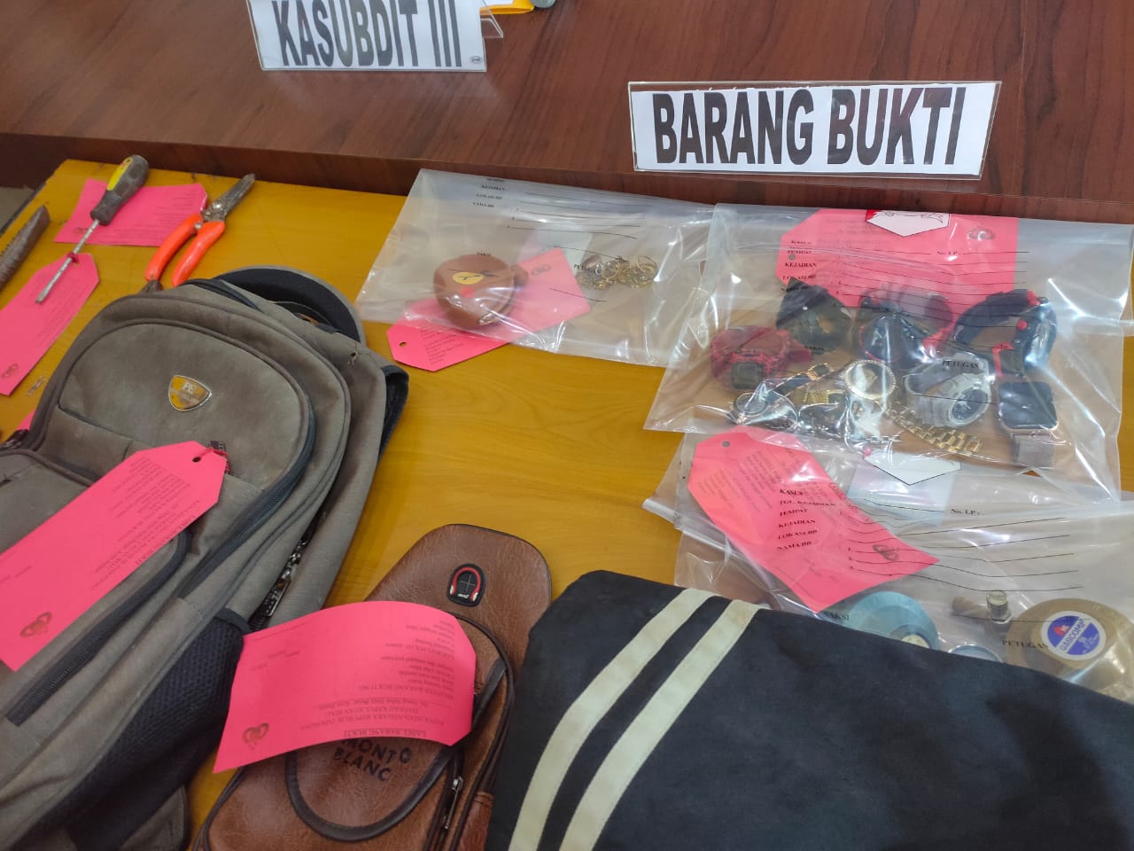 ″Barang Bukti yang diamankan adalah 1 Unit Mobil Toyota Avanza warna Putih, 1 buah tang jepit, 1 buah obeng minus, 1 buah Kunci Inggris, 1 buah kunci L, 1 buah Cuting dengan gagang warna Orange, 1 buah linggis, 2 buah Regulator tabung gas, 10 Unit Jam Tangan, 4 buah cincin perhiasan, 1 buah gelang tangan perhiasan, 4 Unit Speaker, 1 buah tas slempang warna coklat, 2 buah tas ransel, 1 buah tas sandang dan seekor Kucing Himalaya warna Hitam″. Tutur Kasubdit Jatanras Ditreskrimum Polda Kepri AKBP Robby Topan Manusiwa, S.Ik.