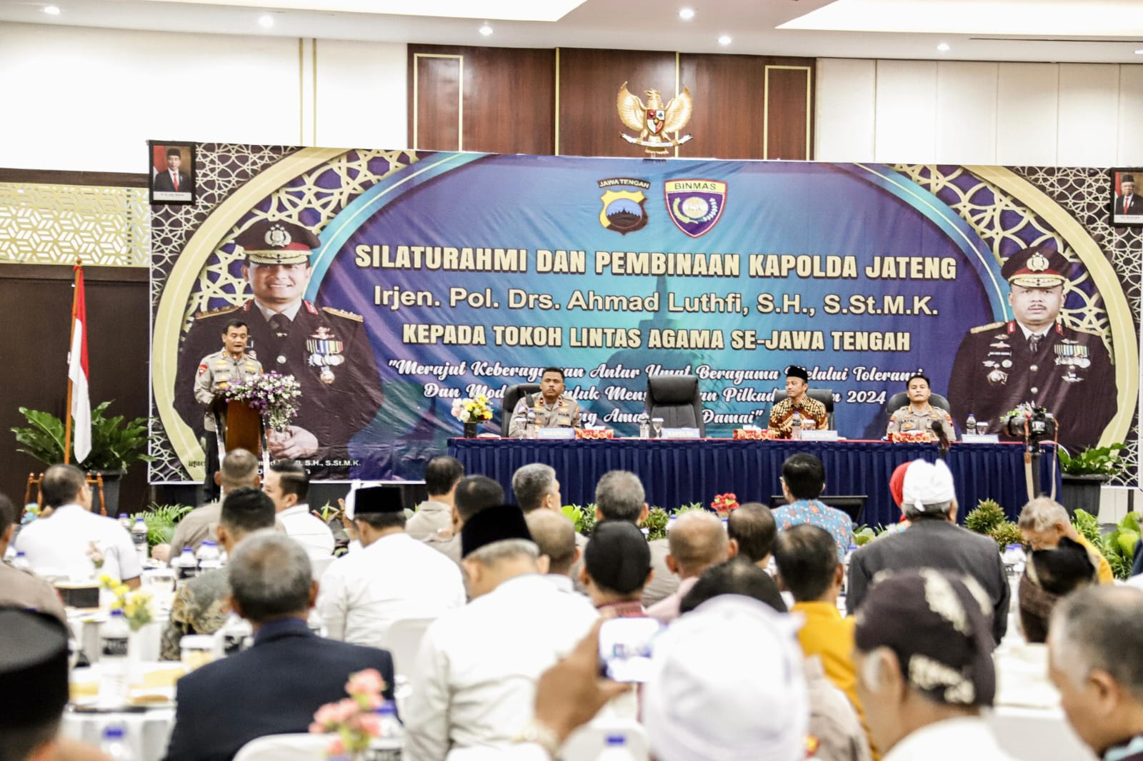 BPI91.COM, JAWA TENGAH, – Kapolda Jawa Tengah, Irjen Pol Ahmad Luthfi, gelar acara Silaturahmi dan Pembinaan bersama tokoh lintas agama se-Jawa Tengah di Legacy Convention Hall Hotel Plampitan, Kota Semarang pada Rabu (26/6/24). Acara ini mengusung tema ” Merajut Keberagaman Antar Umat Beragama Melalui Toleransi dan Moderasi untuk Mensukseskan Pilkada Tahun 2024 yang Aman dan Damai ”