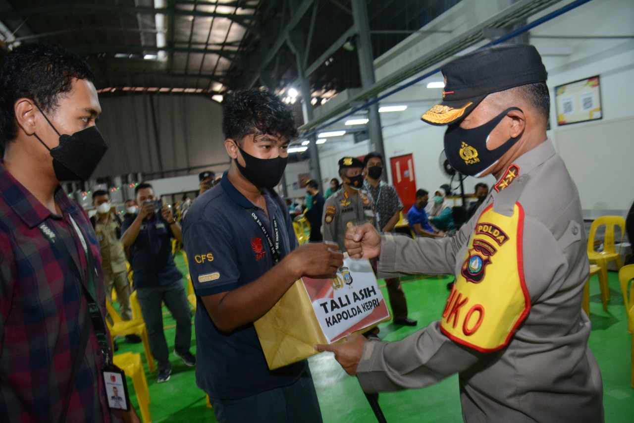 Sebelum kegiatan virtual dengan Kapolri berlangsung, Kapolda Kepri memberikan bantuan sembako kepada perwakilan peserta vaksinasi di Batam Aero Technic Kecamatan Nongsa, Batam.