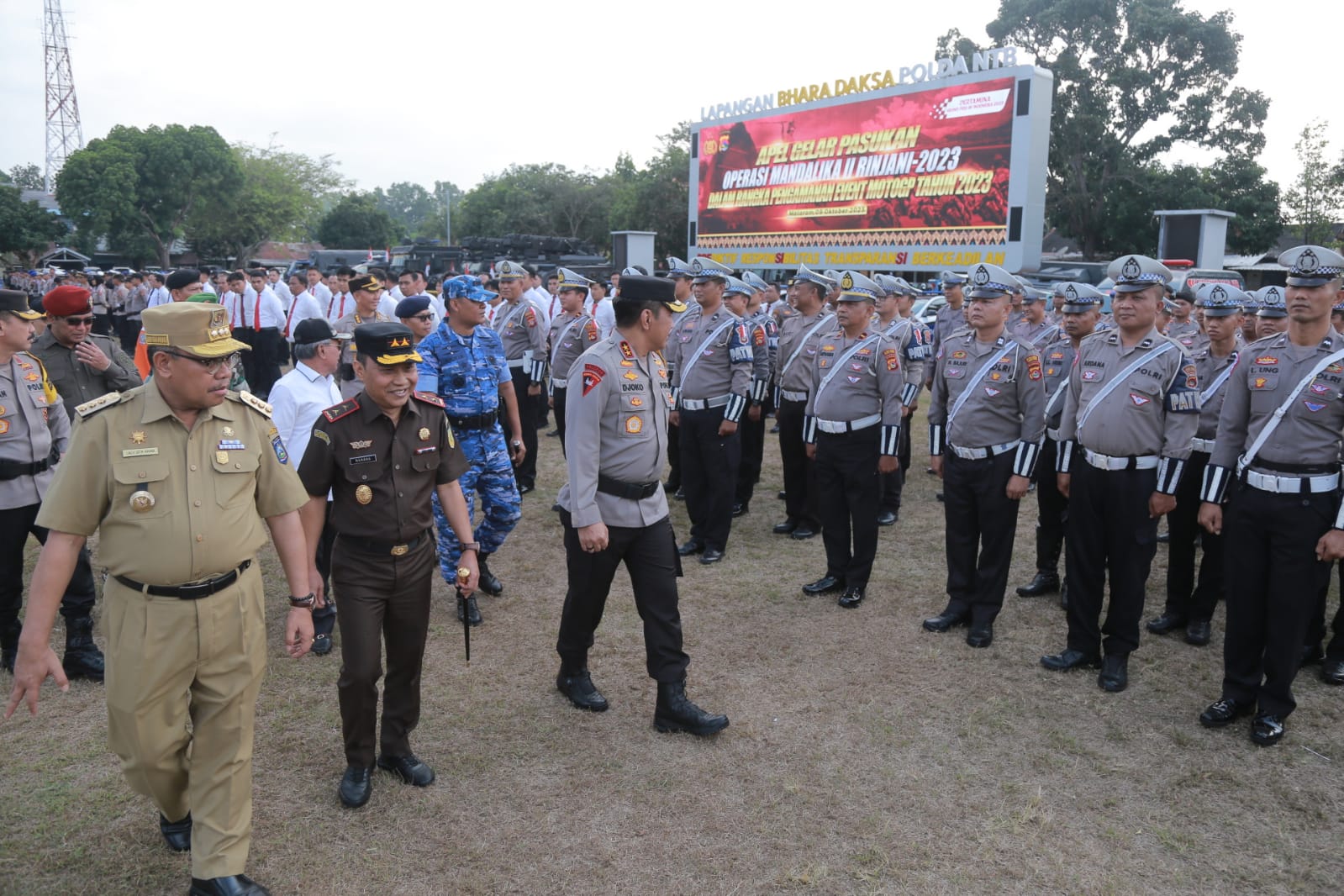 Kapolda NTB Irjen Pol. Djoko Poerwanto, Senin (9/10/2023) pagi, memimpin Apel Gelar Pasukan Operasi Mandalika II Rinjani 2023 di Lapangan Bhara Daksa Mapolda NTB. Apel iti digelar sebagai bagian dari persiapan besar menjaga kelancaran even spektakuler MotoGP Mandalika 2023.