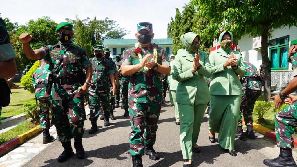 BPI91.COM Padang – Pangdam I/BB Mayjen TNI Achmad Daniel Chardin, SE, MSi, mendampingi Kepala Staf Angkatan Darat (Kasad) Jenderal TNI Dudung Abdurachman, S.E., M.M., bersama ketua umum Persit Kartika Chandra Kirana, Ny Rahma Dudung Abdurachman dalam memberikan pengarahan kepada Prajurit Yonif 133/YS dan Persit di Kota Padang, Sumbar, Rabu (9/3/2022)