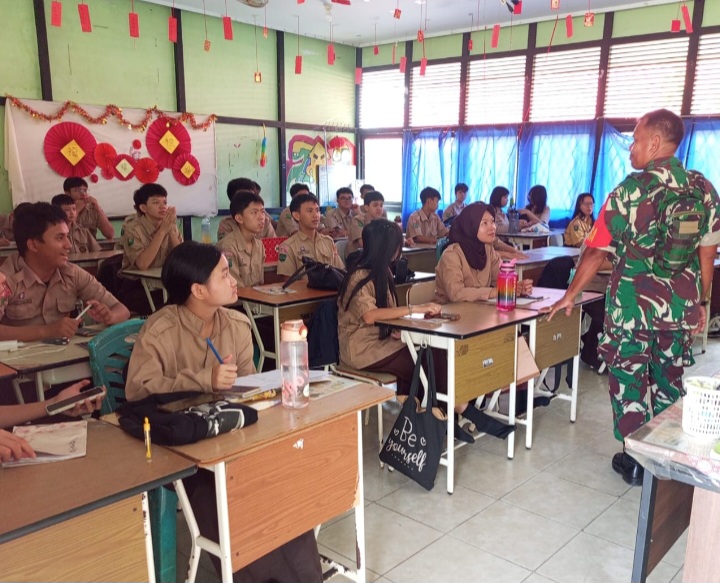 SINGKAWANG, BPI91.COM. Babinsa Koramil 1202-02/Singkawang Selatan, Setu Kamid memberikan materi Wawasan Kebangsaan dan Motivasi Belajar kepada para pelajar SMKN 4 SPP Singkawang, bertempat di Jl. Sagatani, Kelurahan Sijangkung, Kecamatan Singkawang Selatan, Kota Singkawang, pada Sabtu (25/10/2025).