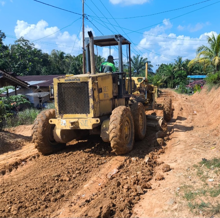 royong melakukan pengusuran Jalan lintas desa Kegiatan ini merupakan bagian dari program TMMD yang bertujuan meningkatkan kesejahteraan masyarakat desa melalui pembangunan fisik dan nonfisik.