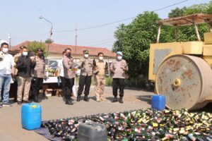 BPI91.COM, Indramayu, – Polres Indramayu jajaran Polda Jabar telah melakukan pemusnahan ribuan botol minuman keras (miras) dengan cara menggilasnya menggunakan alat berat.