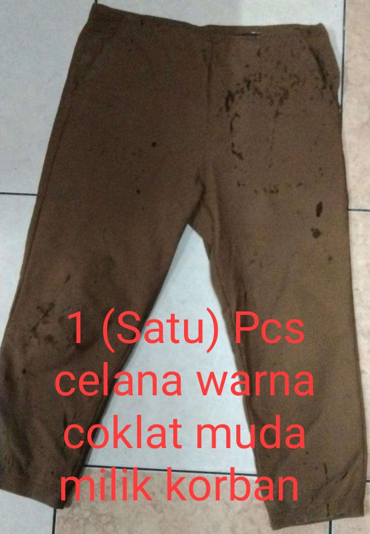 *Pakaian Korban*, 1 (Satu) Pcs kaos lengan pendek, warna Hitam, milik korban, 1 (Satu) Pcs celana warna coklat muda milik korban, 1 (Satu) Pcs kemeja lengan panjang warna merah milik korban.