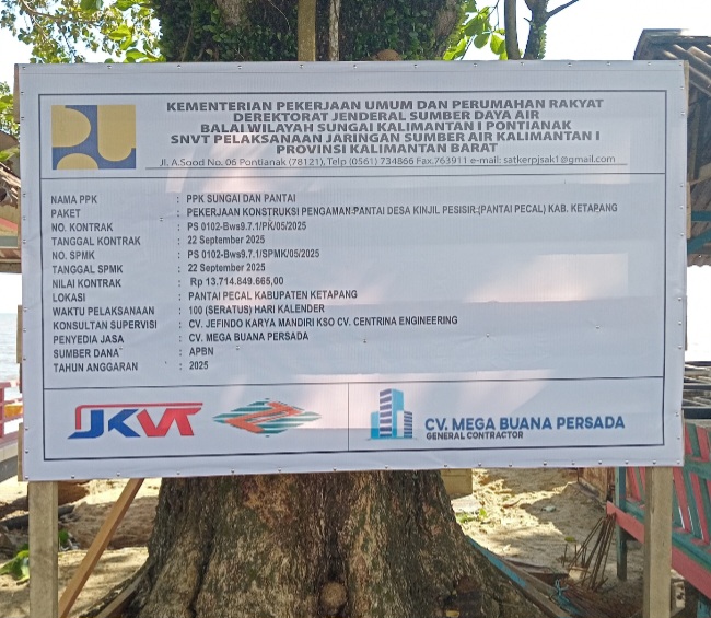 Pelaksanaan pekerjaan konstruksi pengaman pantai Desa Kinjil Pesisir Pantai Pecal Kabupaten Ketapang dilanjutkan, dengan menggunakan sumber dana APBN Tahun Anggaran 2025 melalui Kementerian Pekerjaan  Umum dan Perumahan Rakyat Derektorat Jenderal Sumber daya  Air Balai Wilayah Sungai Kalimantan 1 Pontianak SNVT Pelaksanaan Jaringan Sumber Air Kalimantan 1 Provinsi Kalimantan Barat.