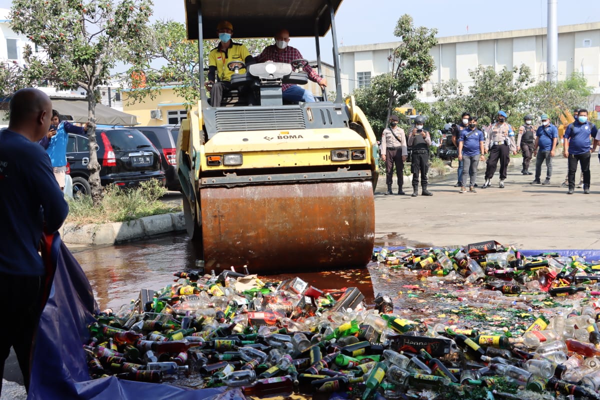 Pemusnahan sebanyak 4.205 botol miras beralkohol dilakukan dengan cara dilindas dengan mesin buldoser atau alat pengeras jalan.