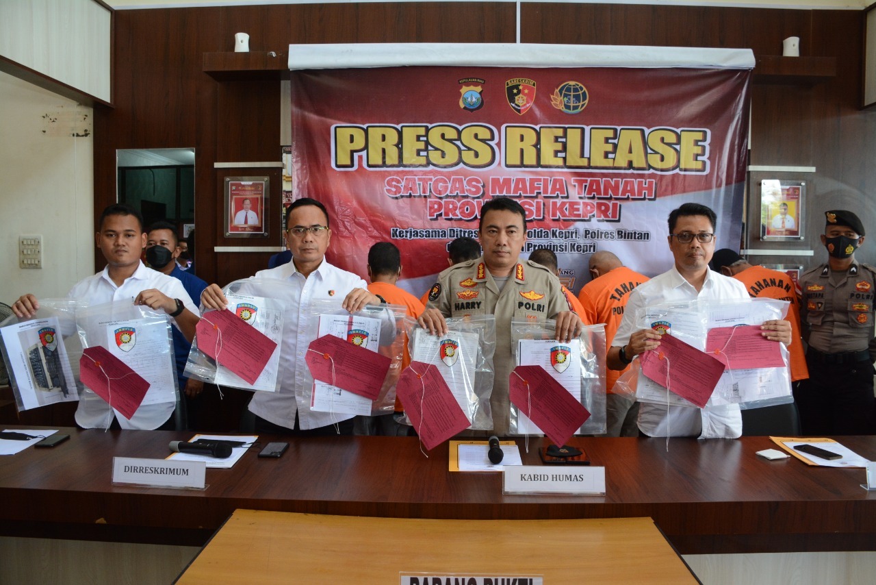 BPI91.COM Batam – Kepri – Satgas Mafia Tanah Polda Kepri yang merupakan kerja sama Ditreskrimum Polda Kepri, Polres Bintan dan Kanwil BPN Provinsi Kepri berhasil mengungkap kasus Pemalsuan Surat Tanah yang berada di Jalan Lintas Barat KM 32, Desa Bintan Buyu Kecamatan Teluk Bintan Kabupaten Bintan Provinsi Kepri dan sebanyak 19 orang di tetapkan menjadi tersangka, hal tersebut disampaikan oleh Kabid Humas Polda Kepri Kombes Pol Harry Goldenhardt S., S.IK., M.Si didampingi Dir Reskrimum Polda Kepri Kombes Pol Jefri Ronald Parulian Siagian, S.I.K, Kabid Penetapan Hak dan Pendaftaran Kanwil BPN Provinsi Kepri Joko Pitoyo Cahyono S.Si.T dan Kasat Reskrim Polres Bintan Iptu M. D. Ardiyaniki, S.T.K., S.I.K., M.Sc pada saat Konferensi Pers di Mapolda Kepri. Rabu (25/5/2022).