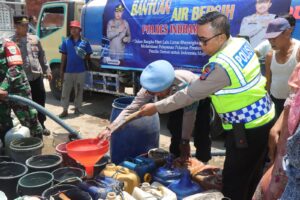 BPI91.COM, CIREBON – Jajaran Satlantas Polresta Cirebon menyalurkan bantuan air bersih untuk warga terdampak kekeringan di Desa Sampiran, Kecamatan Talun, Kabupaten Cirebon, Rabu (13/9/2023). Dalam kegiatan tersebut juga Polresta Cirebon melaksanakan bhakti sosial berupa pembagian paket sembako.