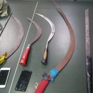 5 orang pemuda berhasil kami amankan berikut berbagai senjata tajam diantaranya 4 buah senjata tajam jenis celurit, 1 buah samurai, ungkap rahmad